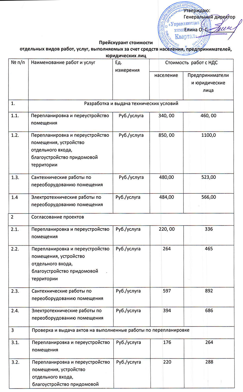 "Уважаемые собственники ООО "Управляющая компания — Квартал" оказывает платные услуги на следующие виды работ".